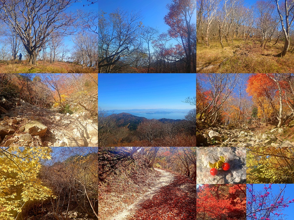 速い若者にどんどん抜かれ、やっと中峠に到着した。エネルギー補給は急務である。風の無い暖かい南斜面で琵琶湖を見ながら小休止。堂満岳は少々鋭角になったかな。杓子木場の頭へのルートは踏み跡が薄い。さて、人の多い武奈ヶ岳を除くとコヤマノタケが目的地。右に登れば特異なブナのコヤマノタケ。初めて見る秋の光景、葉を落としたブナの林のウメモドキは紅一点。枝越しに見る武奈ヶ岳は人で溢れている。