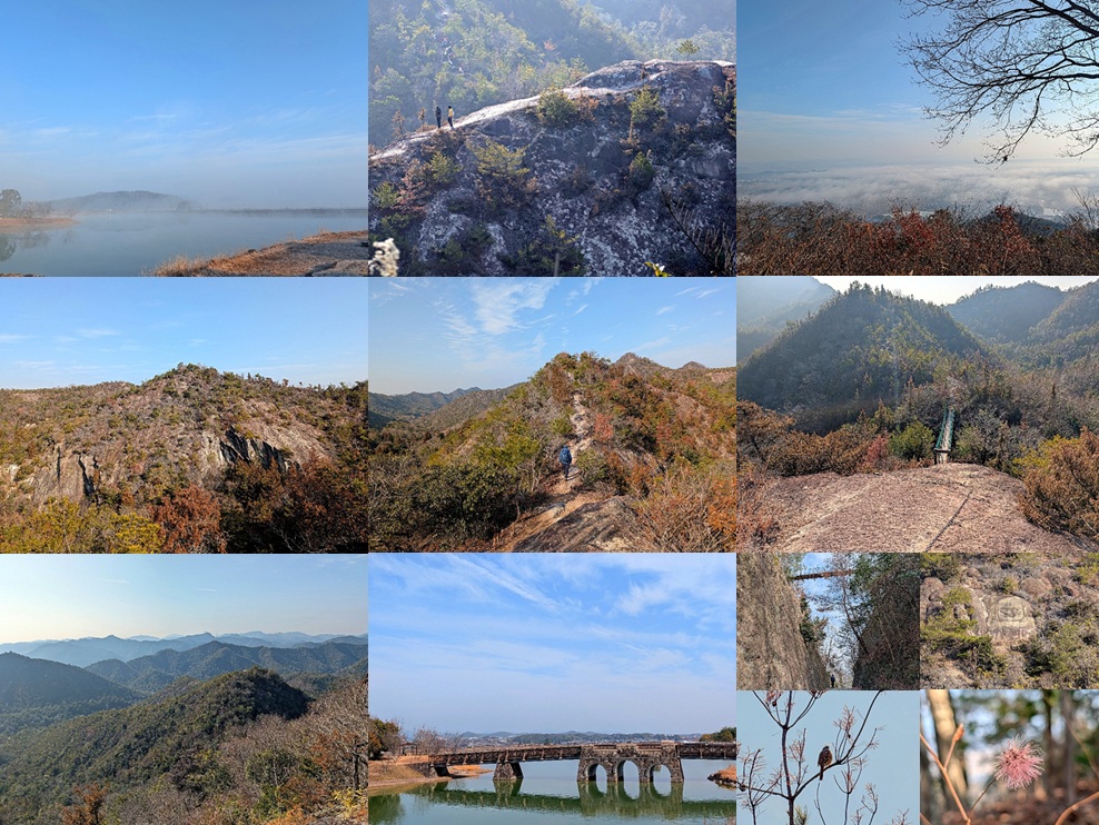 岩の道を暫く降ると全周の展望が拓ける。左右に池を配した街並み、前方に目指す山域、斜度のある岩の細尾根であるから高度感も充分だ。途中で道が分かれる。一方は「周回ルート」とあり、西側を守るお山へ向かう。次回のルートだ。そんな岩尾根を年配のハイカーが往来する。最低鞍部に至ると短いながらも吊橋があった。高さは30m程度、掘割に架けた橋である。大坂山には無いサービスだ。吊橋を渡ると次は鎖場、大きな岩の斜面を登る。鎖は安全の為で、あれば大変に心強い。