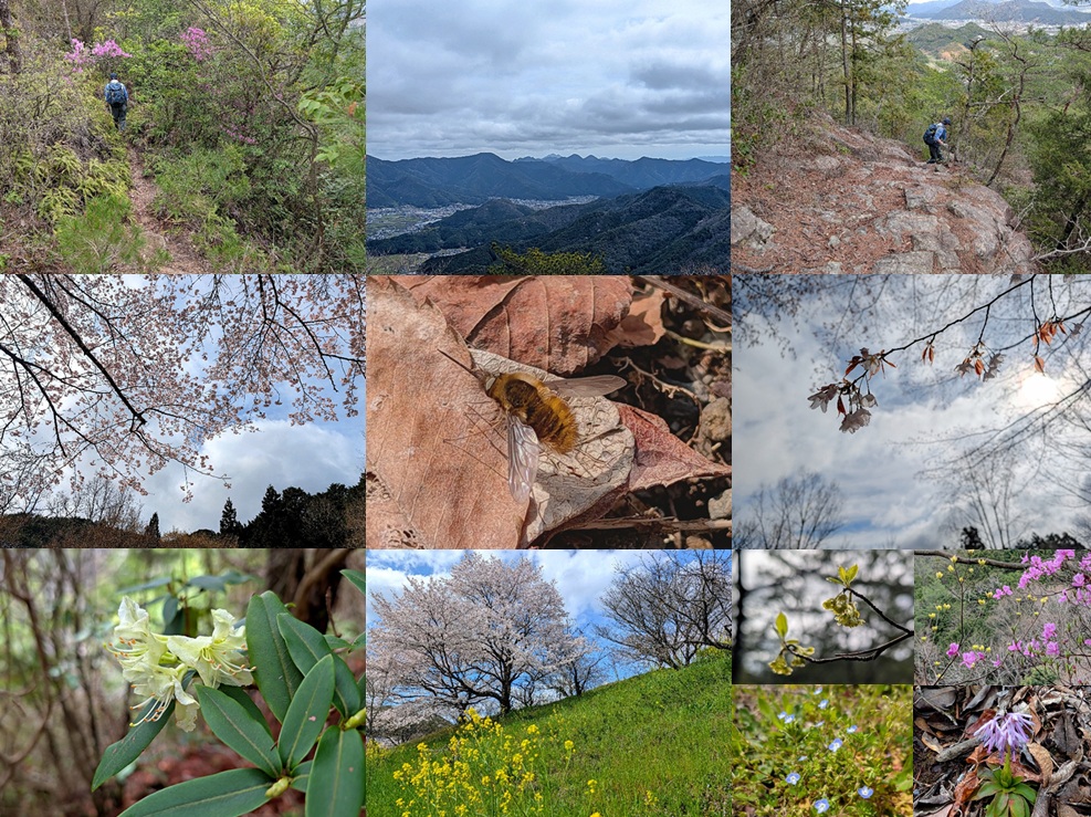 で、静かなコテージを抜けテントサイトを抜け、階段を登る頃には汗が落ちる。それも今年一番の大汗だ。見守るミツバツツジやタムシバ(コブシですね)に心配をかけては申し訳ない。加えて近ごろの頭痛に発汗は有効であるし、ゆっくり歩きで何とかしのげる道であった。短い平坦部からいよいよ岩尾根。今日の岩場は水が流れてよく滑る。歯を食いしばり(歯は縛っていませんが)展望地まで、稼いだ高度は250ばかり。ほろりと舞い降りた山桜さんの花びら1枚。途端に気温は下がり、およそ5℃ばかりも低くなった気温で楽になった。山の精霊達に感謝しよう。