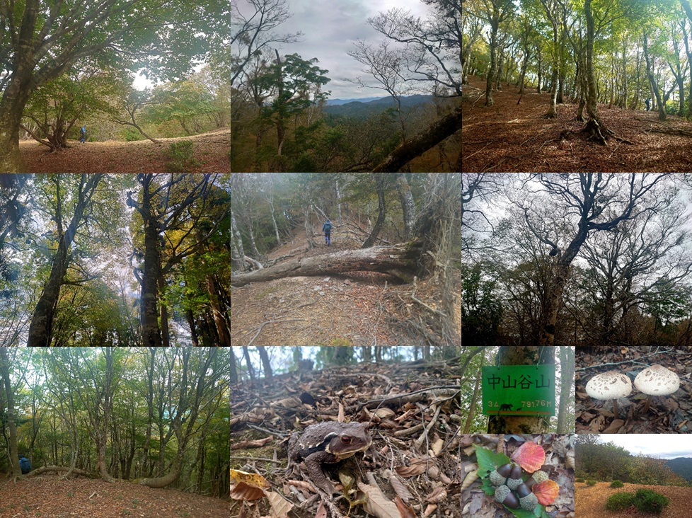 18年の風台風で倒れたブナの上でエネルギー補給。風の音に混じって人の声がする。谷を覗くと遥か谷底で写真を撮るヘルメット姿の三人の姿。キノコ取りか沢登りか知れないが谷底の人は始めて見た。ピークを踏み、北部の森を眺める間に一人はもうそこまで登って来ている。雲行きは愈々怪しくお先に五波峠へ、後方からは元気な声が届いていた。