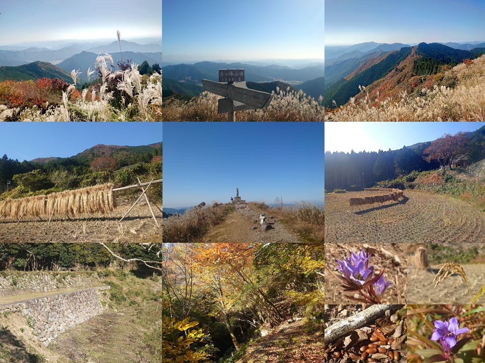 後続が一人二人、笠形山へと続く長大な尾根を、ススキを掻き分け少しだけ辿り、こんなに明るい秋の日に、暗い周回コースは勿体ない。早々にお弁当を拡げる皆様と別れ、久しぶりに岩座神コースを降り集落見物。入れ替わりに7〜8名のパーティが登って行った。このお山ではこれからがもっとも賑やかな時間帯だ。落葉樹の森を抜け、人工林の斜面を降り、平坦な古いお寺跡を降って林道に降りた。紅葉の中のムラサキシキブの実が青い。