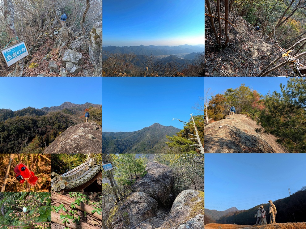 先ずは明剣岳、厚いアベマキの葉のルートはよく滑る。低いながらも展望に優れたピークに溢れる陽射し、なかなかよろしい。見苦しい東の谷を除けば、大寒を控えた厳冬期とも思われない有難い日である。明神山が近くなった。稼いだ高度を惜しみなく放出しつつアップダウンを繰り返し、岩尾根から見る明神山への仰角は増す一方。近くはなっても高度差は埋まらない。342ピークの右に大層立派な岩尾根がある。序にいってもみたいが踏み跡は藪の道。明るい山歩きには相応しくない。やがて凝灰岩らしき岩尾根があり、タヌキ岩の名がある。西に見えて来たのは小明神コースの馬の背、手前の尾根のピークは水平な林道を詰めた先にあり、登るのを諦めたピークだ。つまり明神山との高度差はそれほども埋まってない。